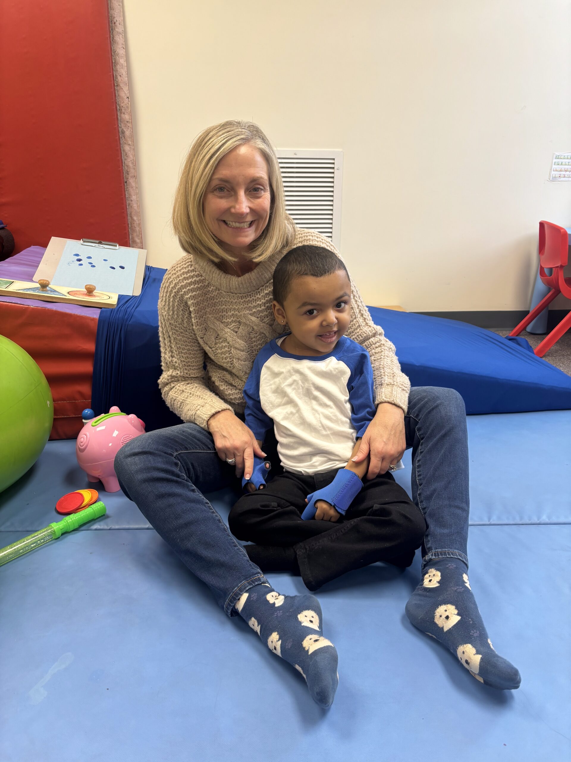 Jayvion receives physical therapy with Ms. Kaitlyn Kelly, occupational therapy with Ms. Lori Brown, and speech therapy with Ms. Annie Gunn and has previously seen Ms. Alicia Rahim for speech and feeding therapy. Together, his therapy team works closely to support movement, communication, and participation in everyday routines, always with the goal of helping Javion feel confident, capable, and included.