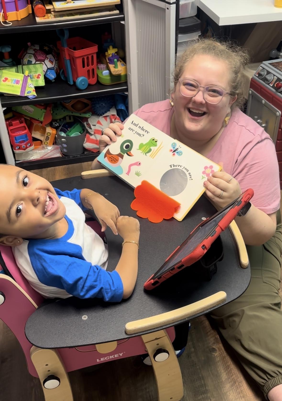 Jayvion reading a book with his speech therapist Ms. Annie Gunn.